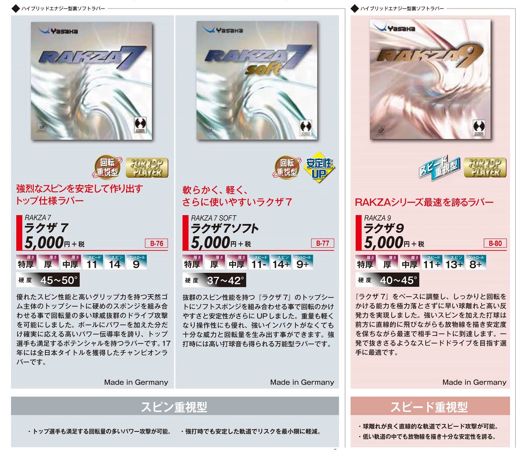 Also, compared to Rakza 7 and Rakza 10, the Yasaka Rakza 9 sponge has a more uniform structure and larger pores.Yasaka Rakza 9 combines a very tenacious elastic top layer (which contains the maximum amount of natural rubber) and a dynamic, relatively rigid sponge with a catapult effect (Power Sponge).