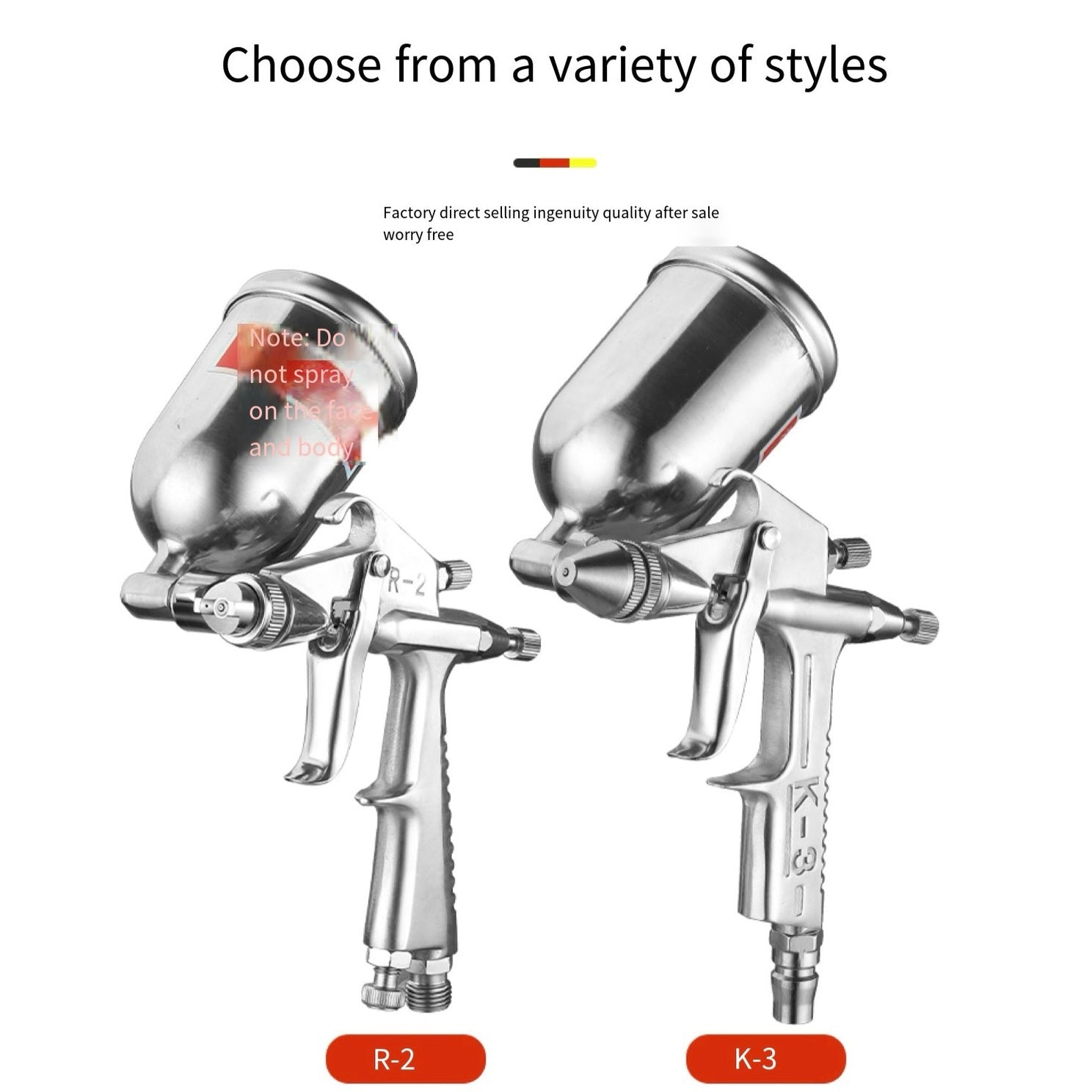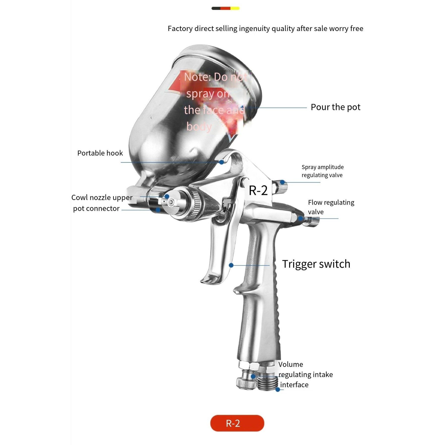 The R-2 spray gun features a precise 1.0mm nozzle designed for smooth and even atomization, ideal for detailed painting and finishing work. Its 200mL top-mounted cup allows for easy handling and reduced paint waste, while the 30–40 PSI operating range ensures efficient, consistent spray performance. The 1/4-inch air inlet fits standard air compressors, providing stable airflow for various coating materials. Compact and reliable, the R-2 is perfect for fine surface finishing, automotive touch-ups, and DIY paint projects.